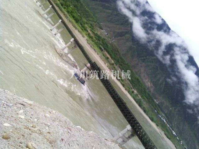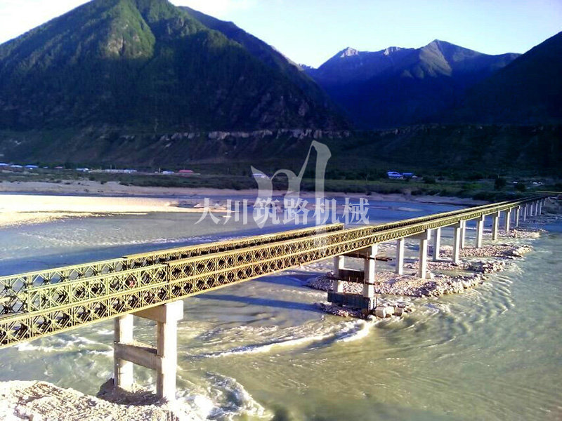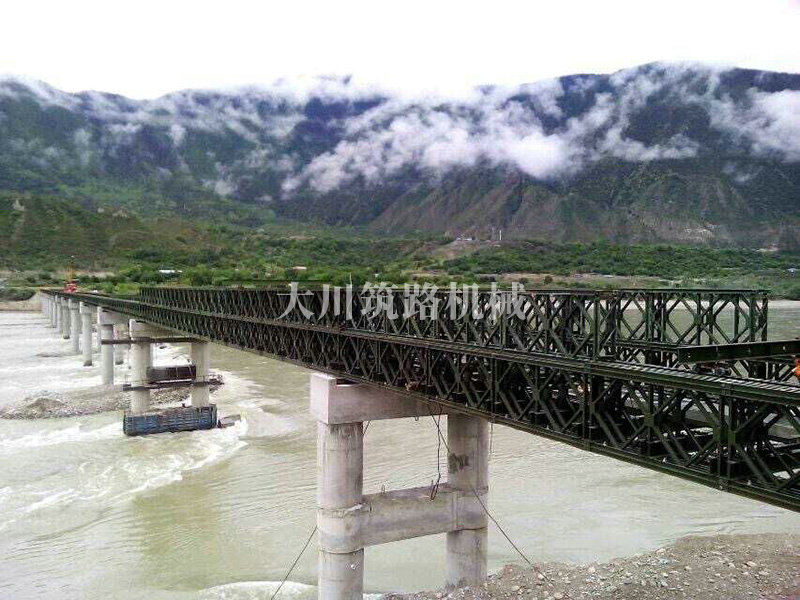 特點(diǎn):本鋼橋拉薩到林芝鐵路控制性工程的重要組成部分,滿足荷載80T施工車(chē)輛通行。主河道水流急,橋墩高,經(jīng)多方多次論證和設(shè)計(jì),最后采用了24+24+24+42+42+24M三排雙層單層混合型加強(qiáng)型雙橫梁下承式鋼橋。克服了施工難度大、氧氣較稀薄等因難因素,采用推出法安裝,于2015年6月通車(chē)。